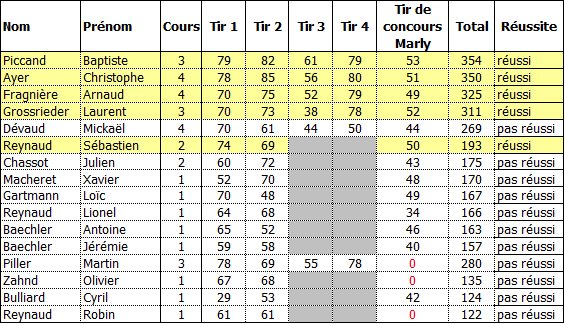 Le Cours JT est maintenant terminé ; voici les résultats à l'issue du Tir de concours (Marly). Bravo à ceux qui ont réussi et que les autres sachent s'en inspirer !
